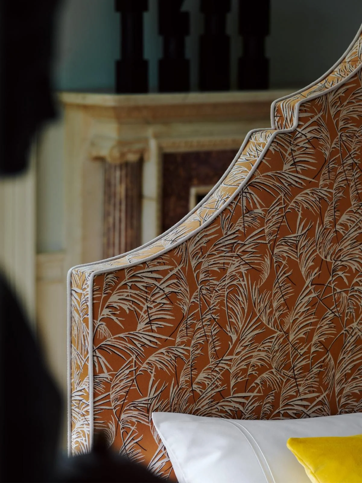 A true essence of European design, Claudia, like the architect of this very Manor, dares to stand out. Italian Rococo silhouettes shape its unique headboard. The fabric, designed by the Parisian brand Lelievre is weaved with three contrasting colours that complement each other. A juxtaposition of the graphic print and a traditional headboard shape add a moment of playfulness. The bed design is accentuated with crisp piping and Georgian legs, which nod to the Georgian architecture of the Eating Room.