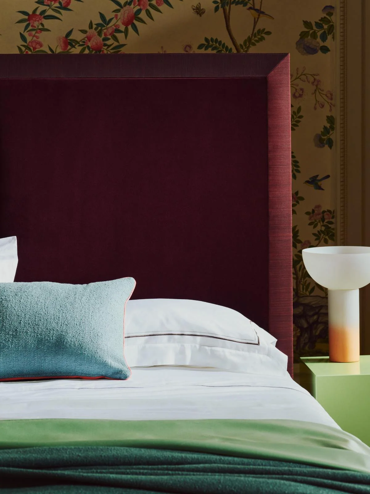 Max’s headboard is hand-upholstered in one of our favourite fabrics, the ‘Adamo and Eva’ by Dedar. Accentuated with an intricate border in horsehair fabric by John Boyd. The deep and rich colour of both fabrics is a nod to the gilded, artistic soul of the Manor. The beauty of this bed design is its versatility. Sat against minimal surroundings, it’ll create a dramatic sense of glamour and elegance. When paired with a more maximalist décor, it’ll feel right at home.