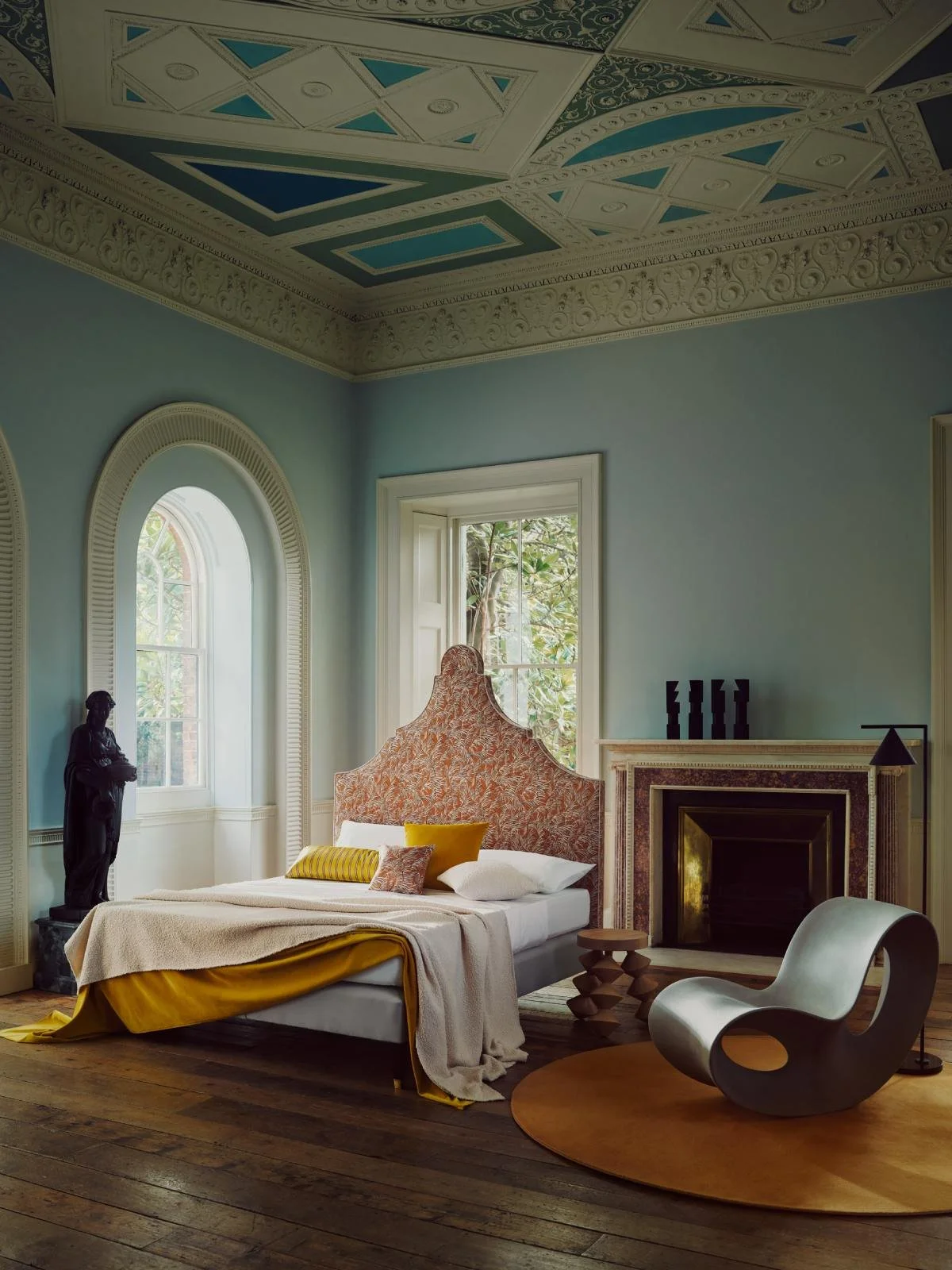 The Drawing Room is where we found the perfect place to photograph our Max design. Situated directly above the Eating Room and made to precisely the same dimensions, the two rooms couldn’t be more different. As opposed to the rest of the house, where intricate ceilings take centre stage, drawing your eyes upwards, this room is a maximalist’s dream come true. Its walls are adorned with a beautifully intricate Chinese print. Although the original wallpaper is no longer there, the print was recently painted by hand as part of a restoration project.