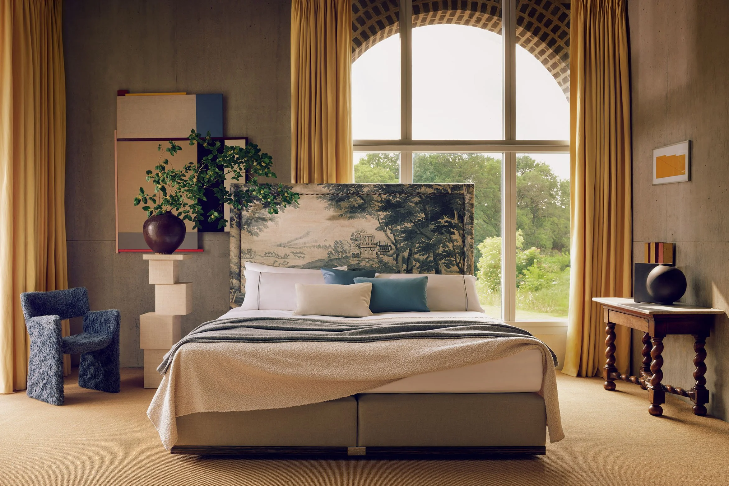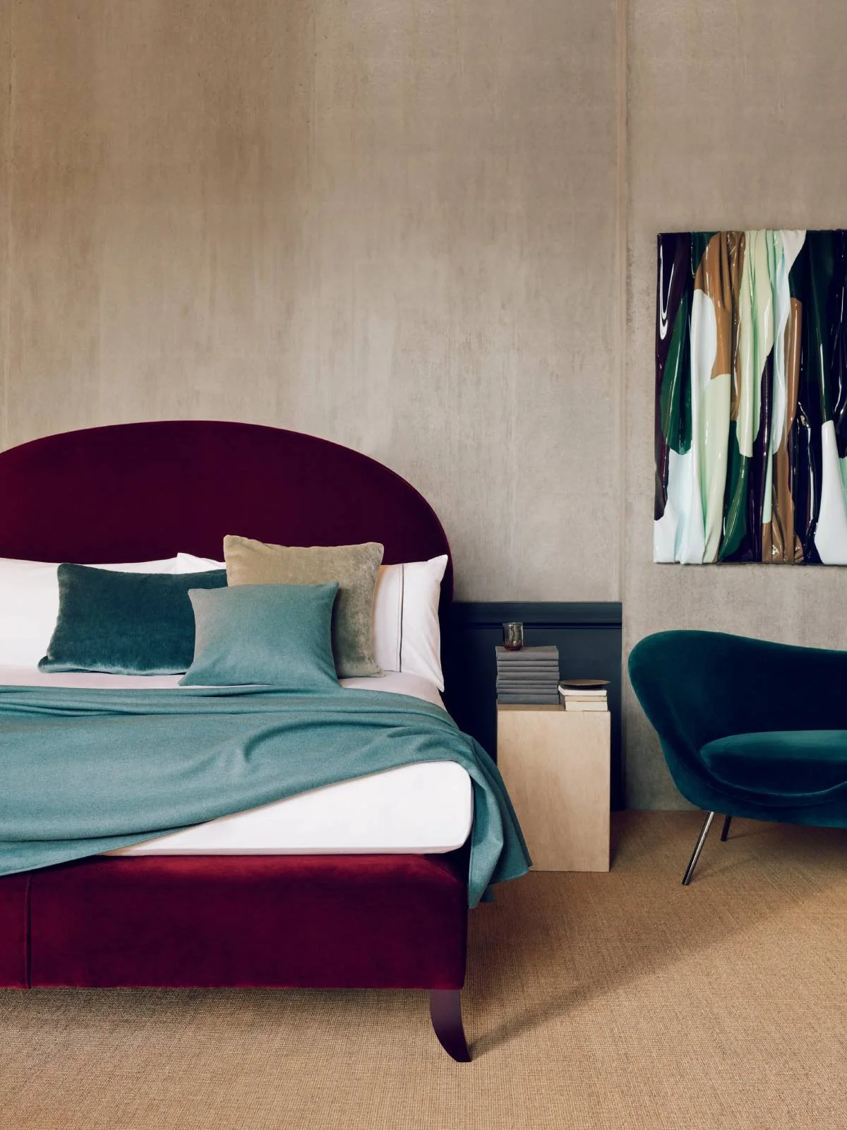 While bedding feels more sumptuous when sized up, accessories follow a slightly different rule. Sania advises that a mix-and-match approach works best when choosing the final touches. “Begin with two large cushions the same size and colour to anchor your scheme, and then add a bolster and perhaps a small cushion in a fun colour or pattern,” she suggests. This allows you to create depth and add playful, unexpected elements without overshadowing the design of the bed and taking away from its luxurious feel.